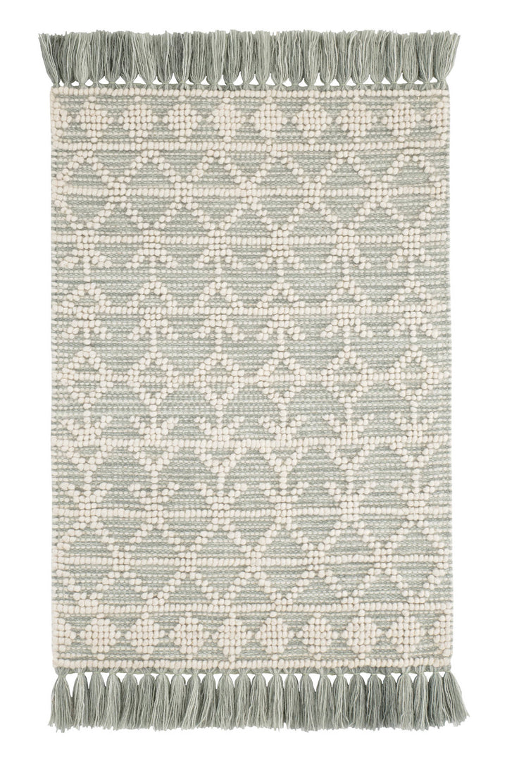 The Pembrook Handwoven Wool Rug has an intricate, Fair Isle-inspired pattern made from raised ivory loops on a flatwoven background. Durable and soft, with a classic knotted fringe to complete the look.