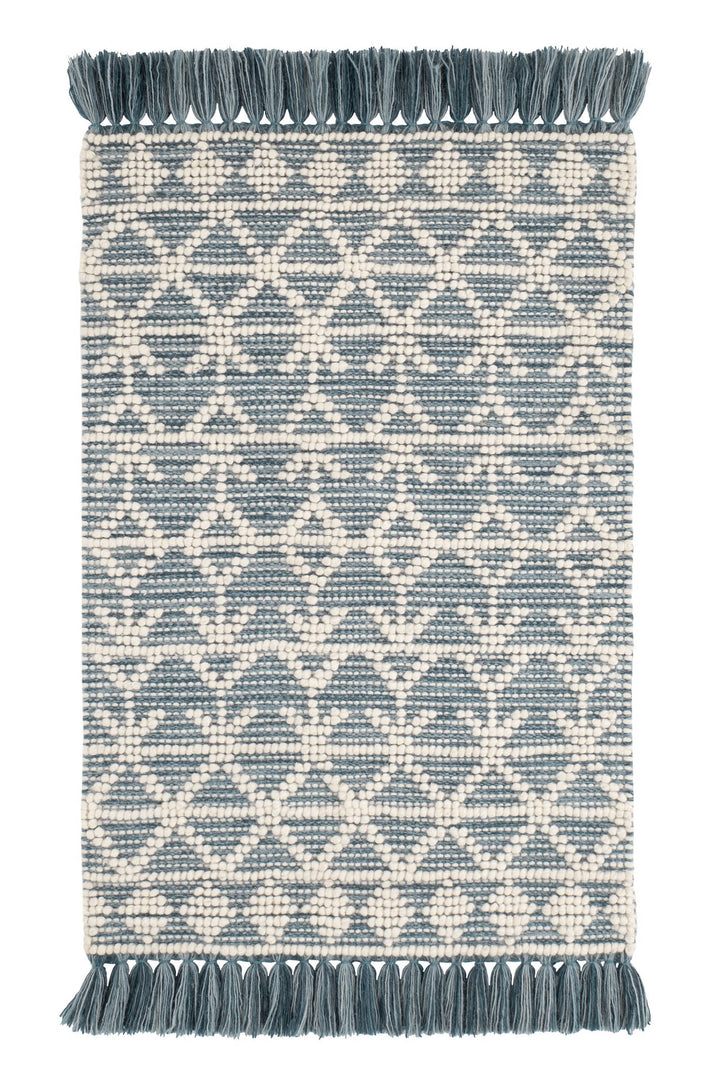 The Pembrook Handwoven Wool Rug has an intricate, Fair Isle-inspired pattern made from raised ivory loops on a flatwoven background. Durable and soft, with a classic knotted fringe to complete the look.
