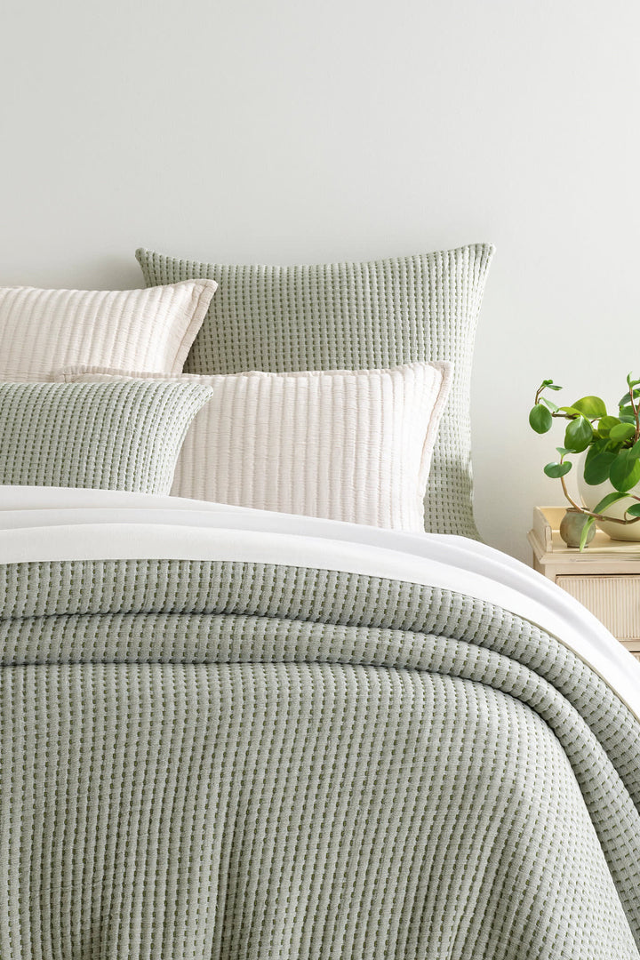 Precisely crafted parallel lines of white pick stitches make a graphic juncture with the black matelassé weave. This lofty, lightweight all-cotton coverlet is meticulously woven to have pockets of warmth that deliver extra nighttime insulation. An all-season essential to layer on the bed as needed. Reverses to same look and feel as the front.
