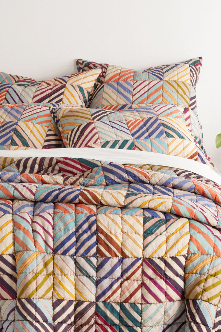 Make a colorful statement with this supersoft and cozy quilt woven from 100% European linen. Stonewashed for incredible softness, it has a silky-smooth backing and a lofty, luxurious drape. The patchwork pattern was inspired by a hand-painted artwork our designers discovered and loved. For a complete, pulled-together look, pair with matching shams and curtains.