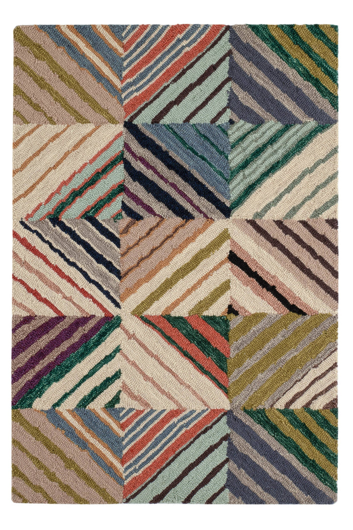 Add color to any space with this durable, one-of-a-kind rug, expertly handcrafted from 100% wool. Inspired by a hand-painted artwork from Europe, its medley of muted hues, patchwork squares, and ticking stripes is simply beguiling.