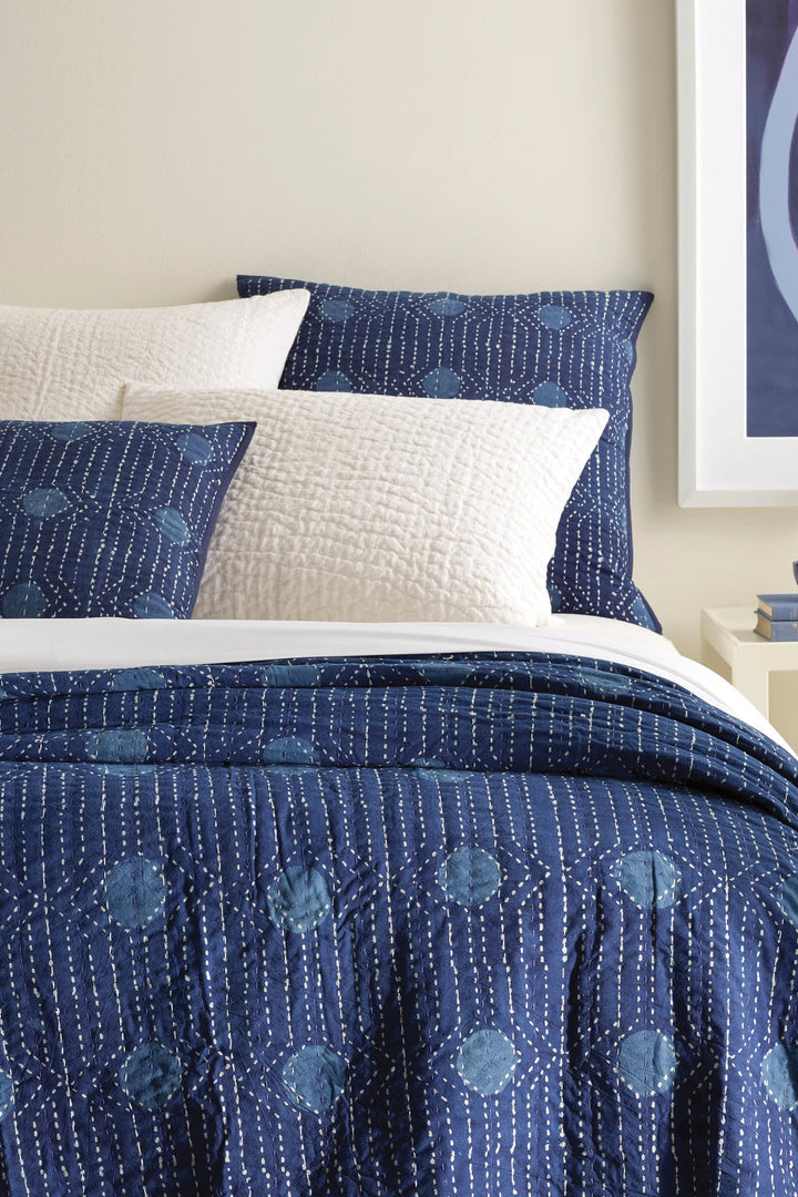 Inspired by traditional Indian kantha quilts, this cotton coverlet features a block-style print on an ink-colored background.