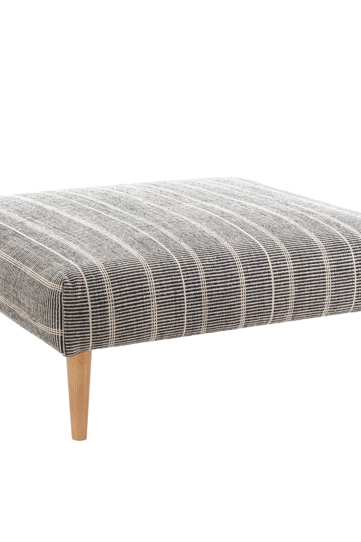 The Samson Handwoven Indoor/Outdoor Rug is now available as an ottoman. This bestselling striped design from our Bunny Williams collection is inspired by an antique rug sample from the designer's own personal collection. The cushioned ottoman is held aloft by a choice of shapely turned-wood legs in a variety of finishes. An ideal placement for front of sofa or end of bed, doing double duty as occasional seating and staging area for a tray. This supersmart addition to entryway, living room or bedroom is a versatile investment piece, available in two sizes.
