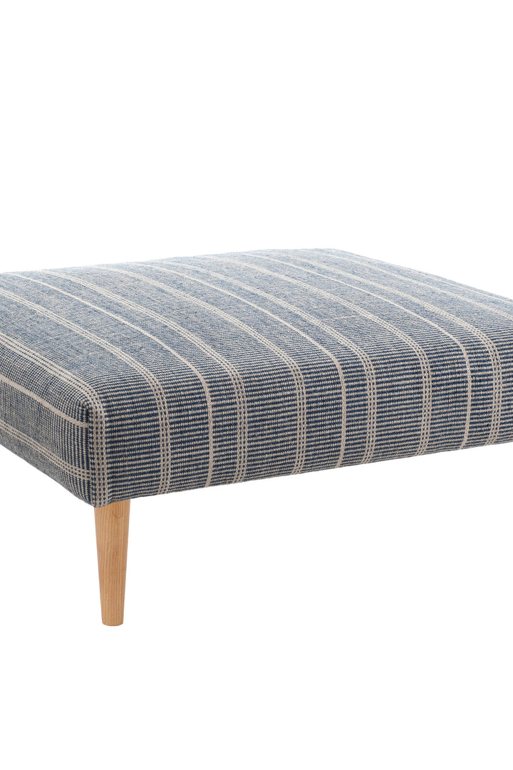 The Samson Handwoven Indoor/Outdoor Rug is now available as an ottoman. This bestselling striped design from our Bunny Williams collection is inspired by an antique rug sample from the designer's own personal collection. The cushioned ottoman is held aloft by a choice of shapely turned-wood legs in a variety of finishes. An ideal placement for front of sofa or end of bed, doing double duty as occasional seating and staging area for a tray. This supersmart addition to entryway, living room or bedroom is a versatile investment piece, available in two sizes.