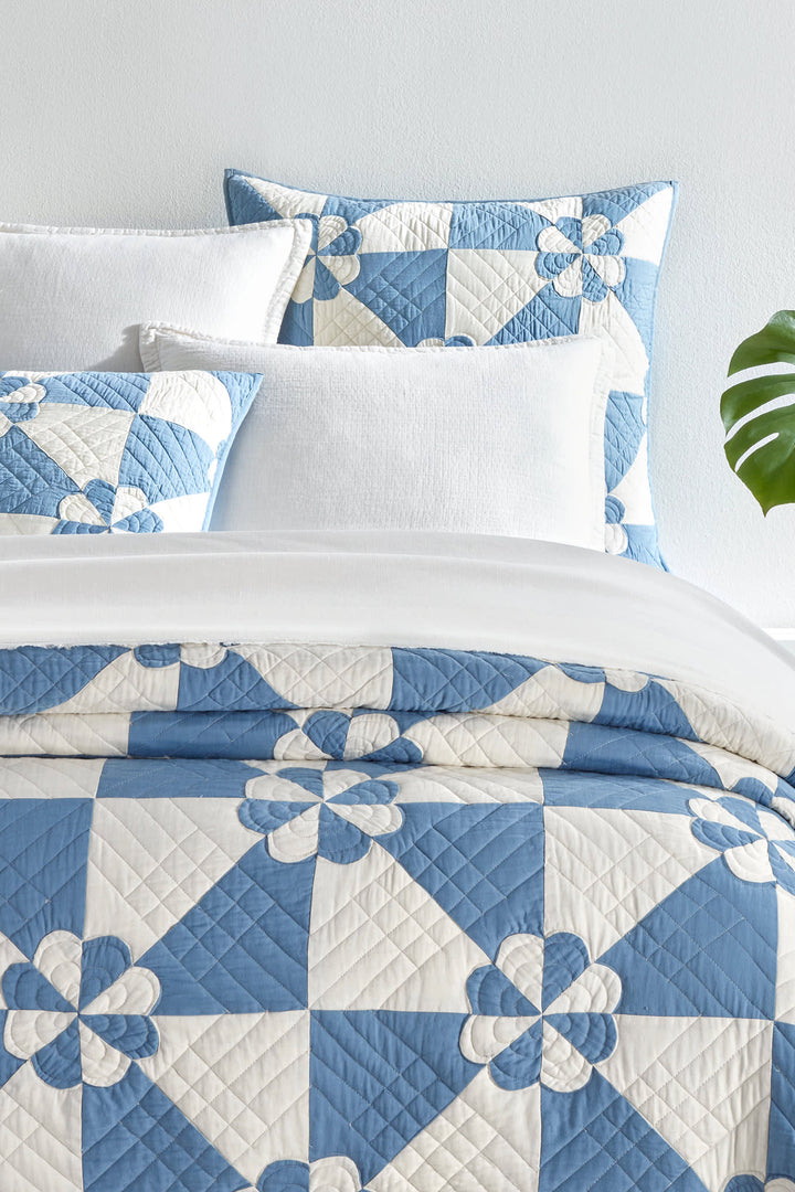 Inspired by an antique textile foraged at Brimfield flea market, we've given traditional a graphic twist. A lightweight patchwork of silky cotton sateen fabric shapes held together with traditional quilting diamonds and sweet petal stitched rosettes; this Modern Americana Quilt is sure to become a family heirloom.