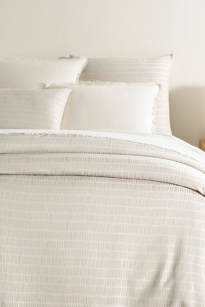 Claim your right to an exquisite night. Light as a feather with a fantastic drape, the ultra-fine density of this sateen weave duvet cover exhibits a subtle sheen. The modern, bi-colored grid pattern is inspired by ancient hand-hewn rock walls stacked in antiquity. Engineered from finely spun, single ply extra-long-staple cotton, woven on jacquard looms and expertly tailored in Portugal. This heirloom-quality bedding is offered in a palette of chalky mineral neutrals. A modern sensibility is expressed through traditional craftsmanship by Marie Flanigan, the award-winning interior designer, architect, and founder and principal of Marie Flanigan Interiors.