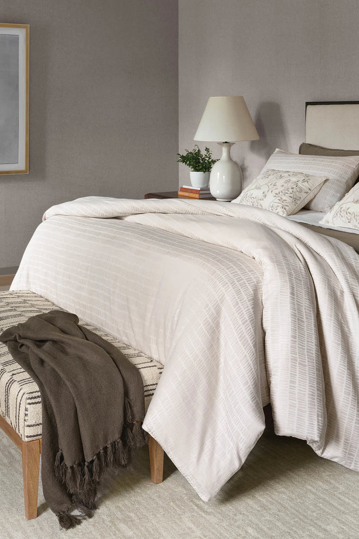 Claim your right to an exquisite night. Light as a feather with a fantastic drape, the ultra-fine density of this sateen weave sham exhibits a subtle sheen. The modern, bi-colored grid pattern is inspired by ancient hand-hewn rock walls stacked in antiquity. Engineered from finely spun, single ply extra-long-staple cotton, woven on jacquard looms and expertly tailored in Portugal. This heirloom-quality bedding is offered in a palette of chalky mineral neutrals. A modern sensibility is expressed through traditional craftsmanship by Marie Flanigan, the award-winning interior designer, architect, and founder and principal of Marie Flanigan Interiors.