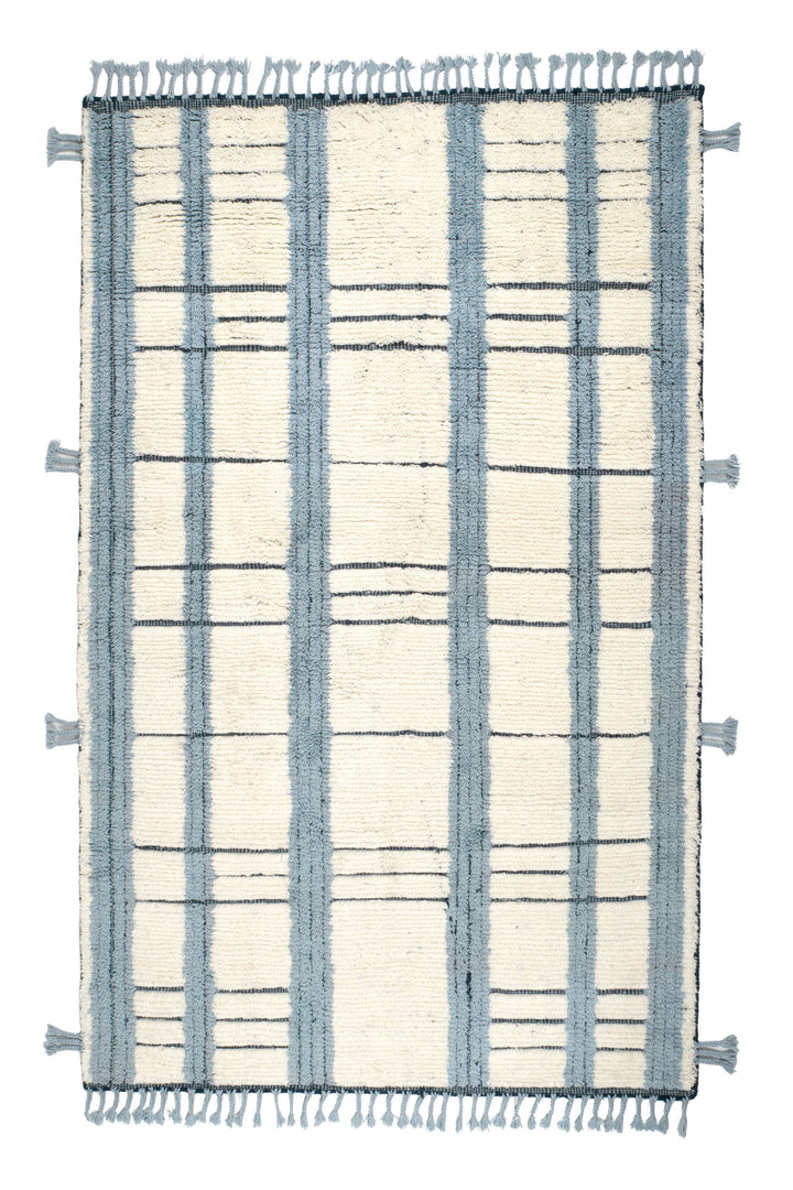 Designed by award-winning interior designer Marie Flanigan, the Tory Pewter Blue Hand Knotted Wool Rug showcases ivory and pewter blue stripes in a plush high-low weave, bringing rich texture and dimension to your floors. Soft underfoot and accented with bohemian braided tassels, it’s both comfortable and visually striking. Perfect for living rooms or bedrooms, this rug adds character and style while keeping things cozy.