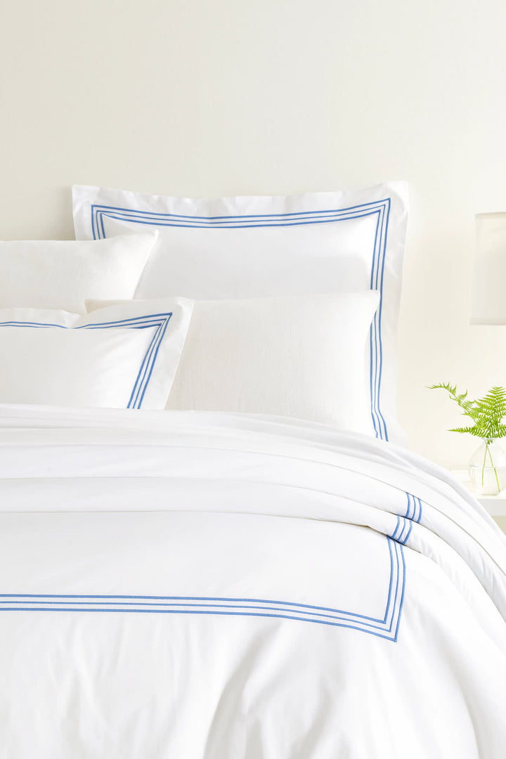 A simple, three-lined pattern adds a touch of refinement to this classic white, 400-thread-count cotton duvet cover.