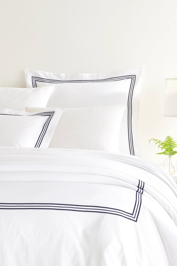 A simple, three-lined pattern adds a touch of refinement to this classic white, 400-thread-count cotton duvet cover.