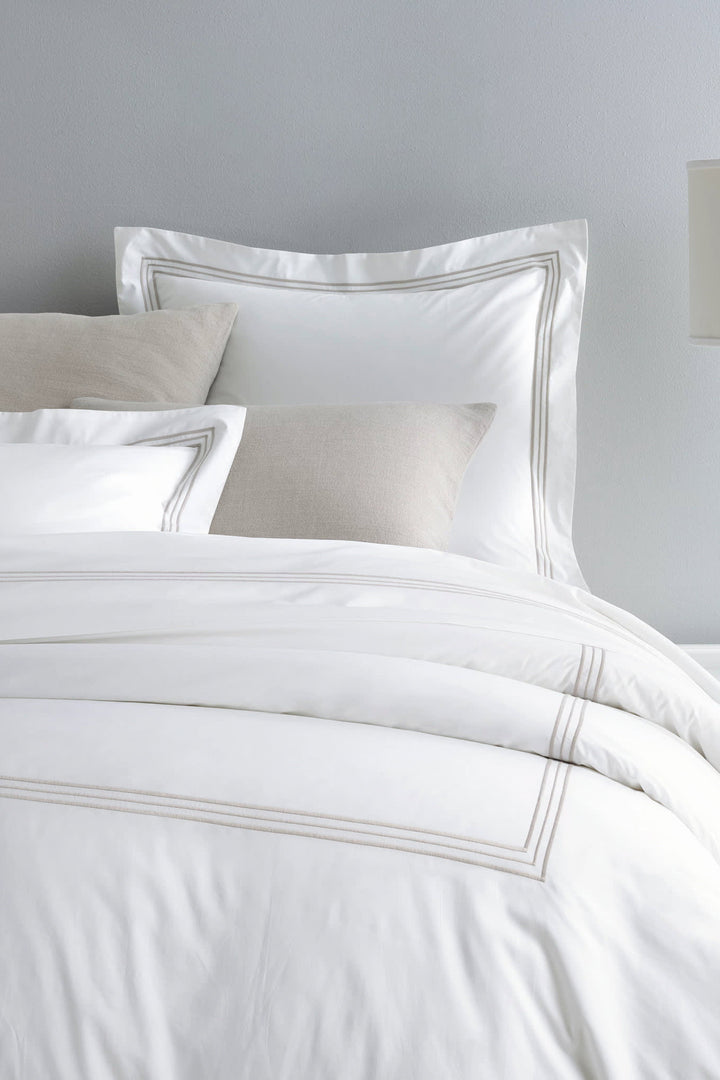 A simple, three-lined pattern adds a touch of refinement to this classic white, 400-thread-count cotton duvet cover.