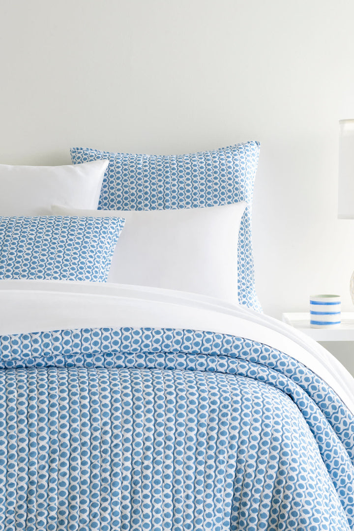 Mixing up your decor has never been easier than with this reversible cotton quilt in a classic French blue. Featuring a quirky circle print on the front and a dashed stripe on the other, this quilt pairs seamlessly with our French blue C3 coordinates, classic white sheets and shams, and even other brights like green and fuchsia. <br> <br> � 100% cotton. <br> � Straight edge. <br> � Coordinating stripe on back side and piping.