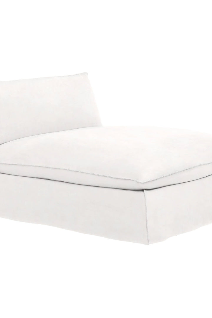 The relaxed silhouette of this modular armless chaise works well in just about any style of decor. As a stand-alone or a component of a sectional, it offers exceptional versatility and the ability to grow with your needs. Kiln dried hardwood framework is the foundation for outstanding support. Generous down and feather padding envelops the eco foam core of the cushions for a soft and nestlike feel. The crisp tailored slipcover and skirt offers customizable style and practicality.